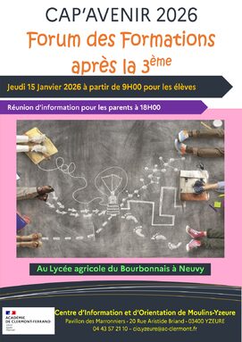Le forum aura lieu le jeudi 15 janvier 2026 à partir de 9h00 au lycée du Bourbonnais à NEUVY. Les élèves s'y rendront avec leur professeur principal selon un planning établi.