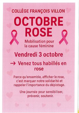 A l'occasion d'OCTOBRE ROSE les élèves et les personnels sont invités à porter un vêtement ou un accessoire rose le vendredi 3 octobre 2025.