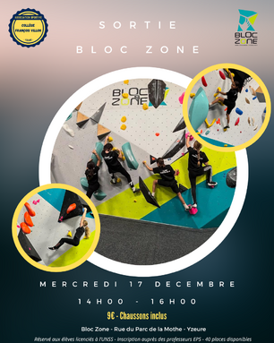 Le mercredi 17 décembre, de 14h00 à 16h00, aura lieu une sortie « Bloc Zone » organisée pour les élèves licenciés.