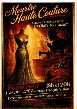 SOIREE MURDER PARTY ORCHESTREE PAR LES ELEVES DE LA CLASSE DE 3EME3 CHAT ET MME FAGNOT LE VENDREDI 27 FEVRIER 2026 A 18H ET 20H
